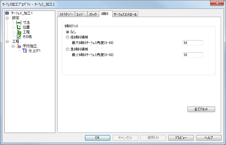 サーフェス加工プロパティ ダイアログの 傾斜 タブを使用して、サーフェス加工ツールパスの傾斜を制限します。