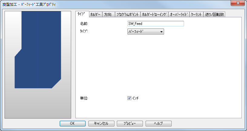 単位 - 工具の寸法の単位です。インチの場合、インチ を選択します。このオプションが選択されていない場合、単位はミリメートルになります。