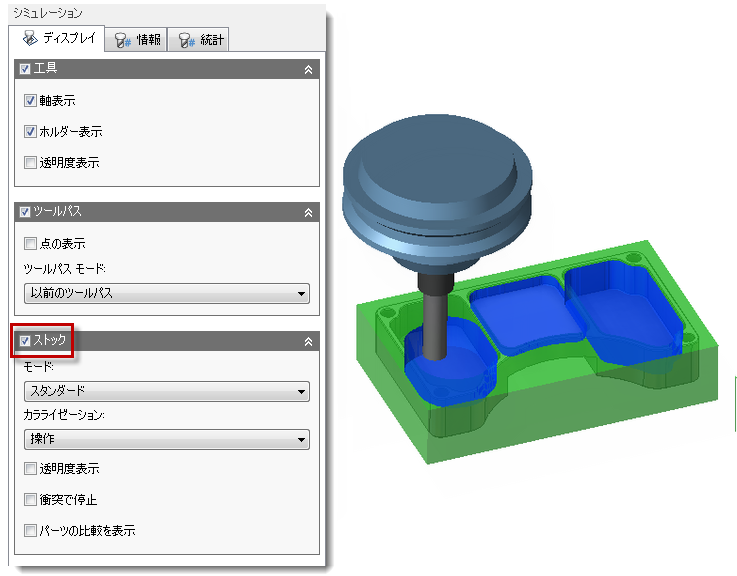 [標準]モードを選択すると、[衝突で停止]チェック ボックスおよび[パーツの比較を表示]チェック ボックスが表示されます。軸、ホルダー、固定具の間で衝突が発生した場合にストック シミュレーションを停止するには、[衝突で停止]チェック ボックスをオンにします。ストックおよびパーツの比較を表示するには、[パーツの比較を表示]チェック ボックスをオンにします。赤はパーツの干渉を示し、青は余分なストックを示します。