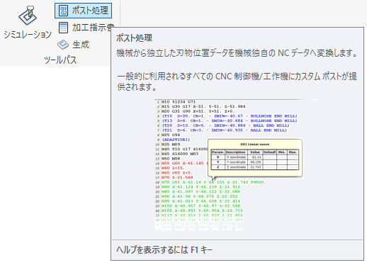 ポスト処理では、画面上でツールパスのイメージを特定の NC 機械の言語に変換します。この出力は通常は G コード形式であり、これは機械工具のコントロールに使用する英数字形式です。異なる機械では、コントロール用にこの G コード形式のバリエーションを使用します。コードにはいくつかの標準化ルールがありますが、すべてのマシンが同じ G コード形式を使用するわけではありません。そのため、Fusion ではさまざまなポスト プロセッサを利用できます。ポスト プロセッサを言語の翻訳ツールとして考えてみましょう。