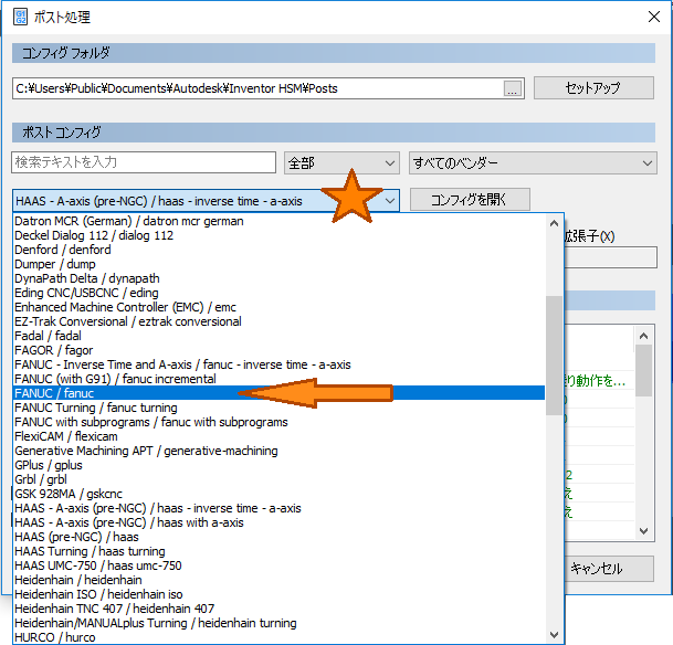 [ポスト処理]ダイアログ ページにはコントロールできる項目がいくつかあります。ここで主に注意すべき点は、正しい加工ポスト プロセッサを選択することです。ダイアログの[ポスト コンフィグ]セクションのリストをプル ダウンして、Fanuc 雛形ポストまでスクロールします。Inventor HSM には、さまざまな CNC コントロール向けに多数のポスト プロセッサが用意されています。