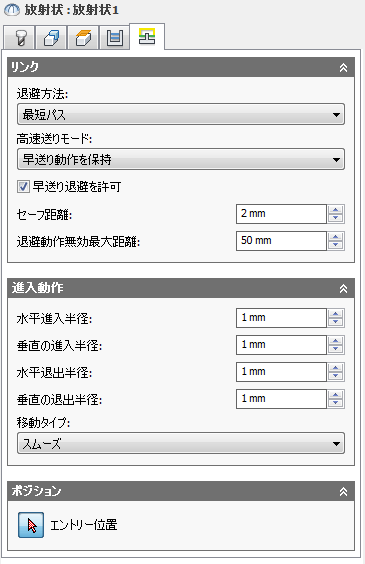 ツールパスへの進入動作およびツールパスからの退出動作の垂直円弧円滑化半径。
