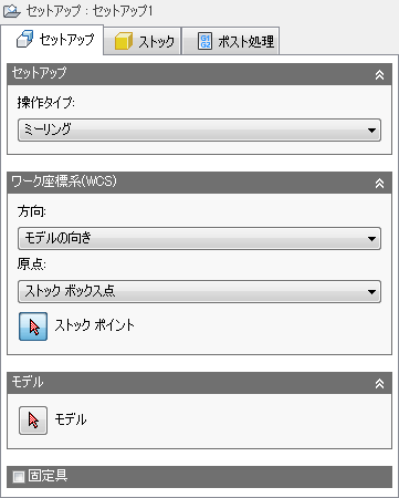 通常、加工操作は、セットアップを作成することから始めます。セットアップでは、ワーク座標系(WCS)、ストック図形、固定具、加工サーフェスなどの、一連の加工に関する多くの一般的なプロパティを定義します。最初の操作を追加する前にセットアップを手動で作成しない場合は、既定のパラメータを使用したセットアップが自動的に作成されます。