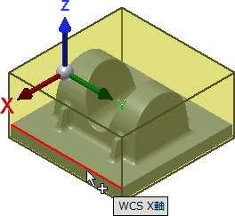 グラフィックス ウィンドウで、パーツの境界領域周辺にストックの材料が自動的に作成されます。モデルの方向は、パーツ上部の WCS で示されます。XYZ による方向と WCS の原点の両方を再定義する必要があります。