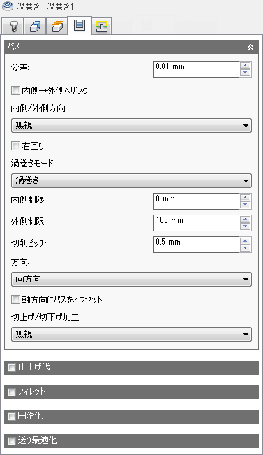 渦巻き仕上げ加工法は、サーフェス上に投影される渦巻きのパスを作成します。丸く、比較的フラットな領域で最も便利です。