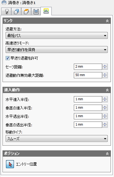 ツールパスへの進入動作およびツールパスからの退出動作の垂直円弧円滑化半径。