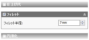 [フィレット]セクションおよび[フィレット半径]パラメータは、[仕上げ代]と[円滑化]セクションの間の[パス]タブにあります。