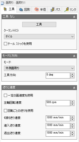 切削動作への進入時に使用される送りです。入力は、回転ごとの送りを使用の設定と、現在の[単位]に基づきます。