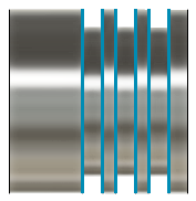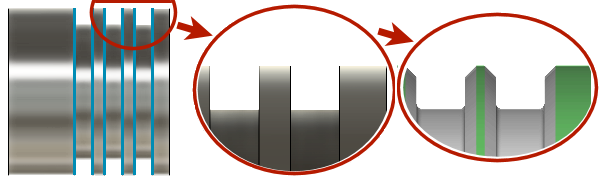 水色で表示され、切削領域の最大半径の境界を定義します。外側(外径)加工の場合、外側半径は、加工予定の外側ストックのサーフェスを定義します。内側(内径)加工の場合、外側半径は、切削領域の最大深さをコントロールします。