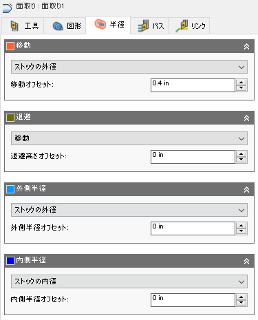 [半径]タブでは、加工向けの半径領域を設定できます。このダイアログ ボックスは、旋盤モード([ツール]タブ パラメータ)が外側面取りと内側面取りのいずれに設定されているかに応じて変わります。これらのパラメータは、識別しやすいように色付けされています。