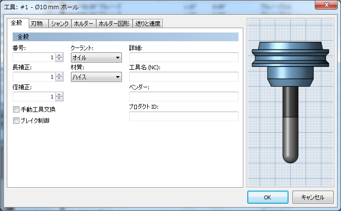 [新規ミル工具]ダイアログ ボックスで、個々の工具を編集することができます。これらは 6 つのタブに分かれています。