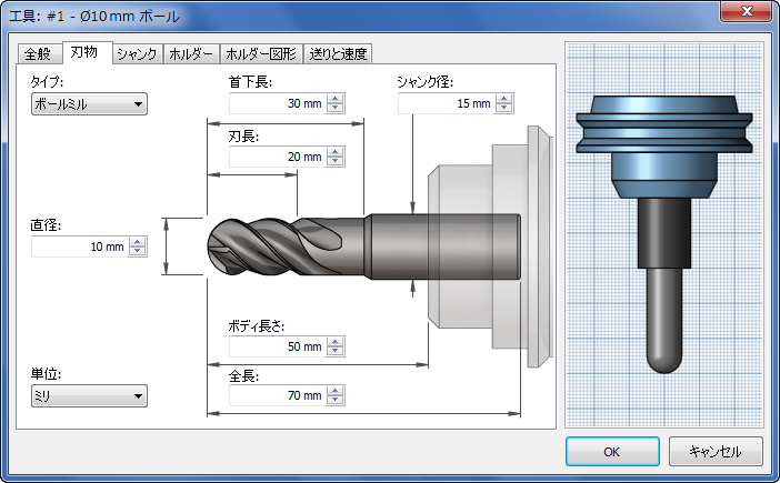 ダイアログ ボックスの右側に工具形状のプレビューが表示され、変更を反映するように自動的に更新されます。