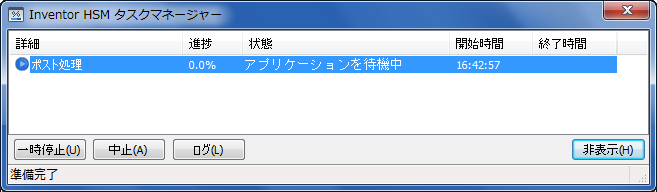 ポスト プロセッサはバックグラウンドで実行されるため、ポスト時に実行されるアプリケーションはメインの Inventor CAM ユーザ インタフェースをブロックしません。ユーザは、ポストが実際にはアプリケーションの完了待ちであることを[タスク マネージャ]で確認することができます。この特定のサンプルでは、これはユーザが「キャンセル」または「承認」のいずれかをクリックするまでです。サードパーティ アプリケーションがスタックした場合は、いつでもInventor CAM のタスク マネージャからポスト処理をすぐに停止することができます。