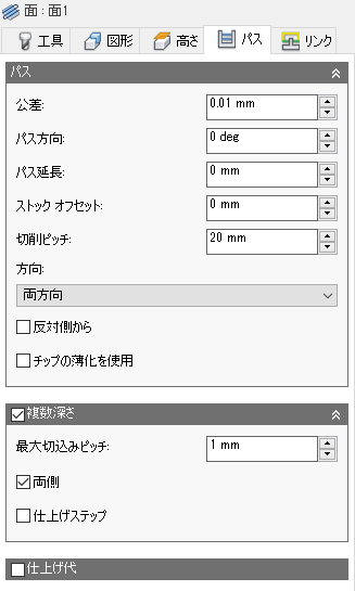 パス間の水平切削ピッチを指定します。既定ではこの値は、工具コーナー半径を差し引いた、カッター直径の 95% です。