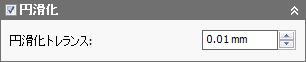 現在、円滑化をコントロールする設定は 2 つのみです。円滑化を有効化または無効化することができ、使用される寸法公差を設定することができます。円滑化は、既定では、常に無効になっています。円滑化フィルタが有効になっている場合は、操作の合計寸法公差は、加工の寸法公差と円滑化の寸法公差によって求められます。既定の寸法公差は、加工の方法と寸法公差から導き出されます。仕上げ操作では、フィルタの寸法公差は、通常は指定された加工の寸法公差の 50 ~ 200 % の範囲(100% で適切な結果になると考えられる)になります。粗取り操作では、フィルタの寸法公差は、通常は 5 ~ 20 % の範囲(10% で適切な結果になると考えられる)になります。