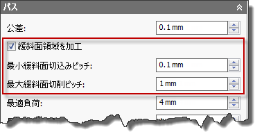 このパラメータは追加の Z レベルを挿入する必要のある領域を検出するために使用される切削ピッチをコントロールします。標準切込みピッチの結果がこの値よりも大きい切削ピッチとなる場合、切削ピッチまたは最小切込みピッチに達するまで追加レベルが挿入されます。