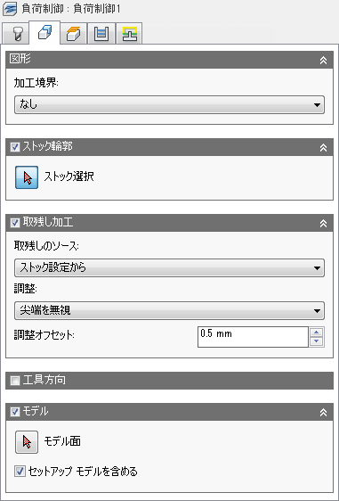 [正の仕上げ代]: 後続の粗取りまたは仕上げ操作で削除すべき、操作後の残りストックの量です。粗取り操作のために、既定値は少量の材料を残します。