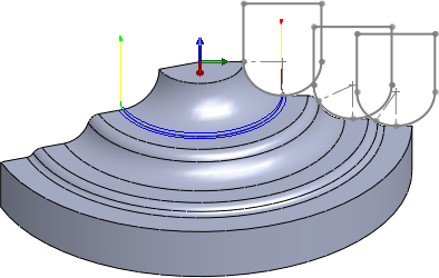 次の例では、異なるサイズの 3 つの丸い "段差" を持つパーツで 20 mm のボール エンド工具を使用しています。[二接角度]パラメータは、加工するエッジのコントロールに使用することができます。