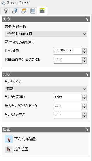 長いスロットで[プロファイル - ランプ タイプ]を使用する場合、最大ランプ深さを指定します。これにより、非常に深いスロットまたは非常に短いスロットでの工具負荷が制限されます。