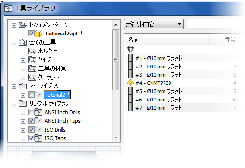 注: 別のフォルダにエクスポートする場合は、そのフォルダを[ライブラリ]ダイアログ ボックスで追加するまで、ライブラリは工具ライブラリには表示されません。また、[ライブラリから工具をインポート]オプションを使用して、ライブラリから工具をインポートすることができます。
