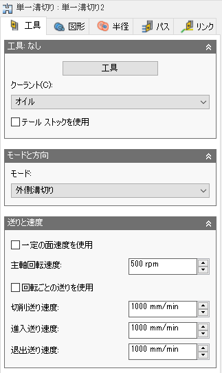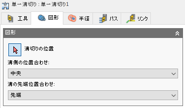 [単一溝切り]加工法は、選択した位置でのみ溝切りを行う場合に使用します。インサートの幅に等しい溝切りを作成します。ねじの背後のクリアランスの溝切りを作成するのに最適です。
