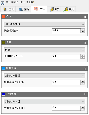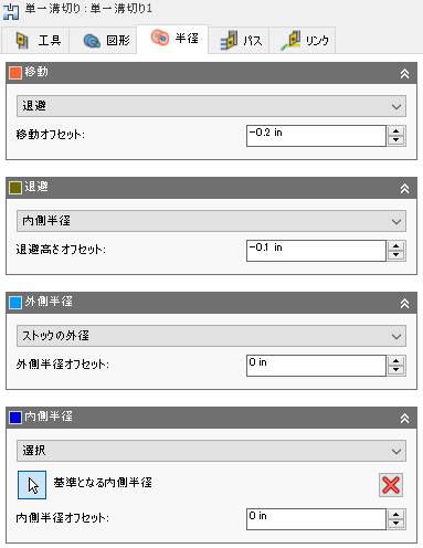 [半径]タブでは、加工向けの半径領域を設定できます。このダイアログ ボックスは、旋盤モード([ツール]タブ パラメータ)が外側溝切りと内側溝切りのいずれに設定されているかに応じて変わります。これらのパラメータは、識別しやすいように色付けされています。