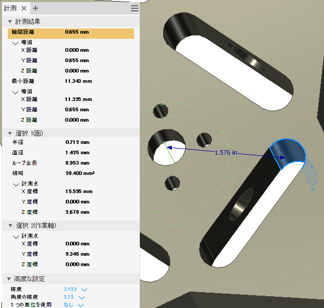 各選択についての情報が、計測ツール パネルとグラフィックス ウィンドウに表示されます。計測ツール パネルでは、選択項目に対して可能なすべての値や、両方の選択項目による結果が表示されます。[計測]ツール パネルで値をクリックすると、選択項目と計測値がグラフィックス ウィンドウに表示されます。