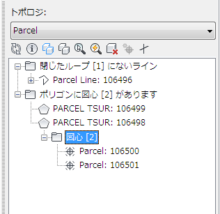 [エリア トポロジ チェッカー]ダイアログ ボックスには、フィーチャ エクスプローラで検出されたすべてのトポロジ エラーが一覧表示されます。