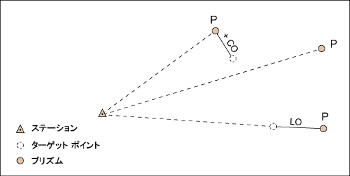 タキメータの測定値では、ターゲット ポイントが直接、計測できない場合、縦のオフセットと横のオフセットが使用されます。