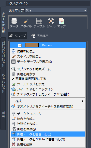 - [表示マネージャ]で[Parcels]画層を右クリックし、[画層データを書き出す]をクリックします。
