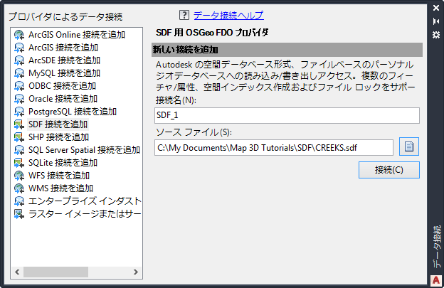 • [プロバイダによるデータ接続][SDF 接続を追加]をクリックします。