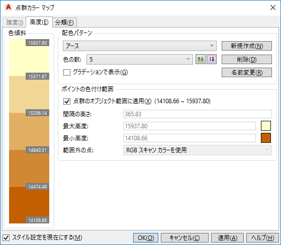 [点群カラー マップ]ダイアログ ボックスで割り当てられた配色パターンに基づいてスタイルが設定されます。 必要なデータが点群内に存在しない場合、このオプションは[スタイル設定]ドロップダウンでグレー表示されます。