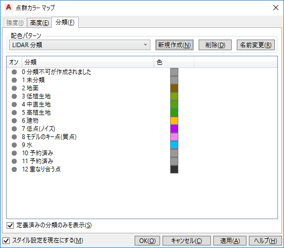 - 表示マネージャで、スタイル設定する点群画層を右クリックし、[スタイルを設定]を選択します。 [点群カラー マップ]ダイアログ ボックスで、[強度]、[高度]、または[分類]タブに移動し、ドロップダウンから配色パターンを選択します。