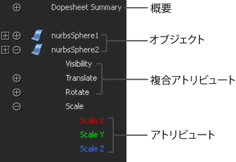 個々のアトリビュートはドープシート アウトライナのアトリビュート階層の最下位レベル