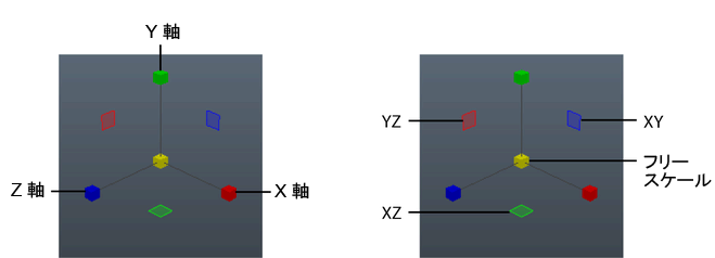 オブジェクトまたはコンポーネントをスケールすると、そのサイズが変わります。スケーリングは、オブジェクトのピボットから行われます。複数のオブジェクトを選択した場合、それらは共通のピボット ポイントからスケールされます。このピボット ポイントは、最後に選択対象に追加されたオブジェクト(キー オブジェクト)です。コンポーネントの場合、ピボット ポイントは、選択したすべてのコンポーネントの中心にあります。