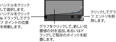 グラフ コントロールには、グラフ領域でドラッグして、位置と値の対を設定することができるハンドルが含まれます。アクティブなポイントは、そのハンドルとアイコンの周りに白い境界が表示されます。グラフは、値が位置ごとに変化する、さまざまなタイプのアトリビュートに使用することができます(ペイント エフェクト設定、流体設定などを含む)。
