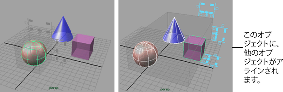 - このサブメニューのオプションを使用すると、オブジェクトを同時にスナップしたり、スペース内のオブジェクトを位置合わせすることができます。また、オブジェクトの選択をカーブに沿って均等に再配置できます。オブジェクトのスナップ位置合わせ(Snap Align Objects)オプションを設定するには、修正 > オブジェクトのスナップ位置合わせ(Modify > Snap Align Objects) > (位置合わせのタイプ) >