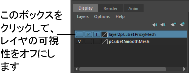 また、ディスプレイ レイヤの可視性を切り替えて、再生中にのみオブジェクトが非表示になるようにすることもできます。アニメーションの再生中に重要でないオブジェクトを非表示にすることで、再生パフォーマンスを向上させることができます。たとえば、再生中にキャラクタのコントロール リグ オブジェクトが非表示になるように設定します。リグはアニメーションの作業中には表示され、再生を押すと非表示になり、再生パフォーマンスが低下しないようになります。