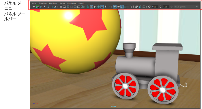 各ビュー パネルの上部にあるパネル ツールバーからは、ツールバーの上のパネル(Panel)メニューにある、多数のよく使用されるコマンドにアクセスできます。[Ctrl]+[Shift]+[M]を押して、パネル ツールバーの表示を切り替えることができます。