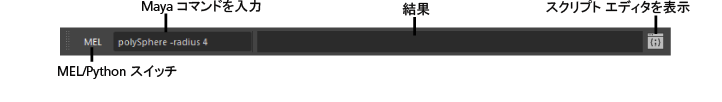 コマンド ラインを使用すると、スクリプト エディタ(Script Editor)を開かずに単独の MEL または Python コマンドを入力することができます。MEL モードと Python モードは、MEL/Python ボタンをクリックして切り替えることができます。コマンドからの結果は出力に表示されます。