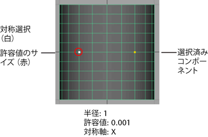 選択されたコンポーネントと、シンメトリ軸の向こう側にあるコンポーネントがシンメトリであるとみなされるためには、互いにどの程度ミラーしていなければならないかを設定します。これはソフト選択(Soft Selection)がオフの場合のみ有効です。