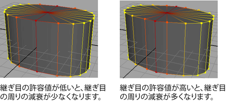 継ぎ目の保持(Preserve Seam)がオンの場合に、シンメトリの継ぎ目の周囲の減衰を設定します。これは、継ぎ目上のコンポーネントをシンメトリ軸から離して変換できない場合に継ぎ目付近の変換のスムーズ程度を制御します。