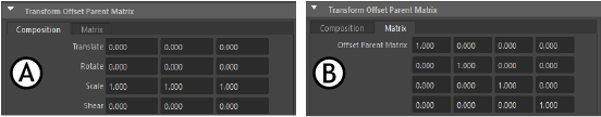 アトリビュート エディタ(Attribute Editor)のトランスフォーム オフセット 親行列(Transform Offset Parent Matrix)タブ A. 合成 B. 行列(Matrix)