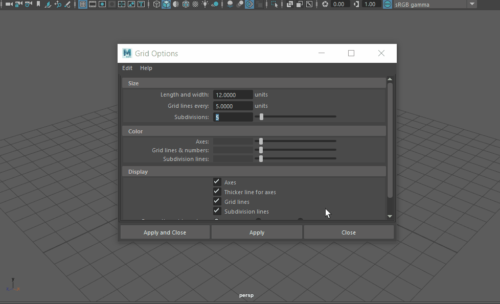 これらのオプションを使用して、Maya のグリッドをカスタマイズします。「グリッドを表示、非表示、または変更する」も参照してください。