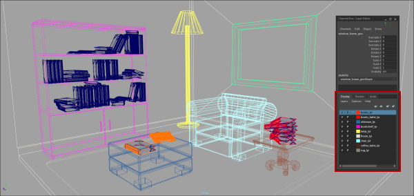 オブジェクトに異なるワイヤフレーム カラーを割り当てて、ビュー内でトラックしやすくすることができます。ワイヤフレーム カラーは、ここに示すように、オブジェクト単位またはディスプレイ レイヤ単位で割り当てることができます。