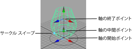 上記の回転の例を用いると、マニピュレータの表示ツール(Show Manipulator Tool)を使ってマニピュレータを表示することにより、回転ノードの選択とアトリビュート(サーフェスの作成方法)の編集を視覚的に行うことができます。