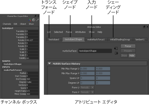 たとえば、作成 > NURBS プリミティブ > 球(Create > NURBS Primitives > Sphere)を選択して球を作成すると、トランスフォーム ノードとシェイプ ノードが作成されます。
