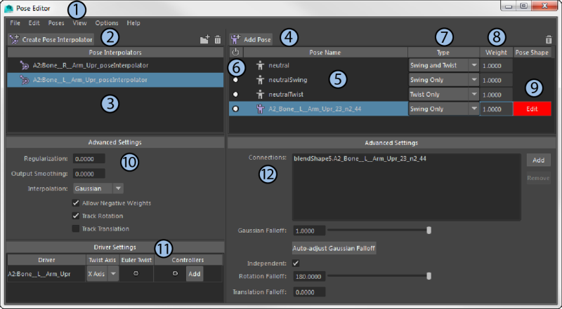 選択したポーズ補間のジョイントを編集できます。このパネルは、を選択するか、ポーズ補間ノード名を右クリックしてドライバ設定を表示(Show Driver Settings)を選択した場合に表示されます。詳細については、以下を参照してください。 |