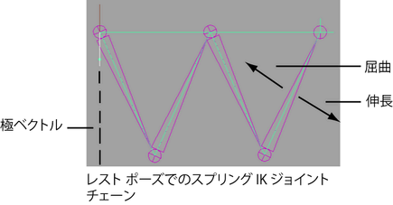 スプリング IK ソルバを使用する IK ハンドルはレスト ポーズを必要とします。既定では、ターゲット ジョイント チェーンの位置と方向はスプリング IK ハンドルの作成時にはレスト ポーズとなります。レスト ポーズでのスプリング IK ジョイント チェーンの最初と最後のジョイント間の距離により、ジョイント チェーンを曲げるか伸ばすか決められ、個々のジョイントの動きに影響を与えます。