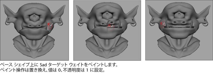 このツールを使って、頂点ごとにブレンド シェイプ ウェイトを設定できます。つまり、ベース シェイプ上にターゲット シェイプが与えるインフルエンスの程度を、よりきめ細かくコントロールできます。また、このツールにより、ターゲット シェイプごとにウェイトをペイントすることも、ターゲット シェイプをミックスしたり、部分的なターゲットを作成することもできます。